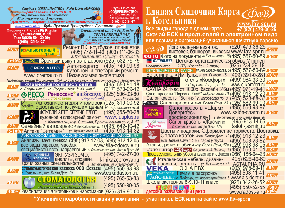 Распространяется бесплатно по почтовым ящикам жителей города, магазинам, торговым центрам, аптекам, гос. учреждениям и другим организациям с высокой проходимостью г. Дзержинский и Котельники. А также CMИ размещена на сайте www.fav-spr.ru с возможностью скачивания и предъявления в электронном виде. О возможности скачать CMИ жители уведомлены дополнительно в объявлениях на досках возле своих подъездов, информационных стендах, баннерах. У участников-компаний размещены наклейки на входе, кассах с надписью «У нас действует Единая Скидочная Карта «ФАВ». www.fav-spr.ru». CMИ г. Дзержинский получила поддержку от администрации города как социально-значимый проект. Поэтому население данного города дополнительно оповещается о CMИ администрацией на местном телевидении, радио, информационных стендах, городских форумах и пр.